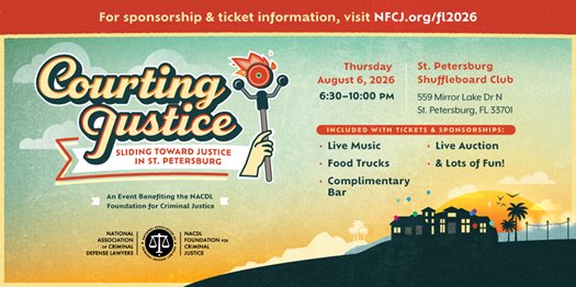 An Event Benefitting NACDL's Foundation for Criminal Justice (NFCJ) Location: St. Petersburg Shuffleboard Club, 6559 Mirror Lake Dr. N., St. Petersburg, FL 33701 For details and to purchase tickets, visit: NFCJ.org/FL2026 |